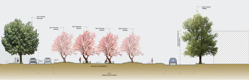 El trazado del parque propone un paseo peatonal longitudinal acompañado de áreas verdes, arborización, un ciclopaseo y diversas áreas con diversos programas. En los extremos del recorrido se localizan dos importantes polos programáticos y multifuncionales. Al norte, se crea un área lúdico-deportiva con una zona de; multicanchas, áreas de esparcimiento, juegos infantiles y zonas de picnic, vinculándose de este modo, con las actividades adyacentes y eventuales que ya se vienen desarrollando en esta ladera, dotándolo así de instalaciones formales. En el extremo sur del parque se proyecta una zona de juegos infantiles y otra de juegos de agua, las cuales se relacionan directamente con áreas urbanas cercanas más densas.