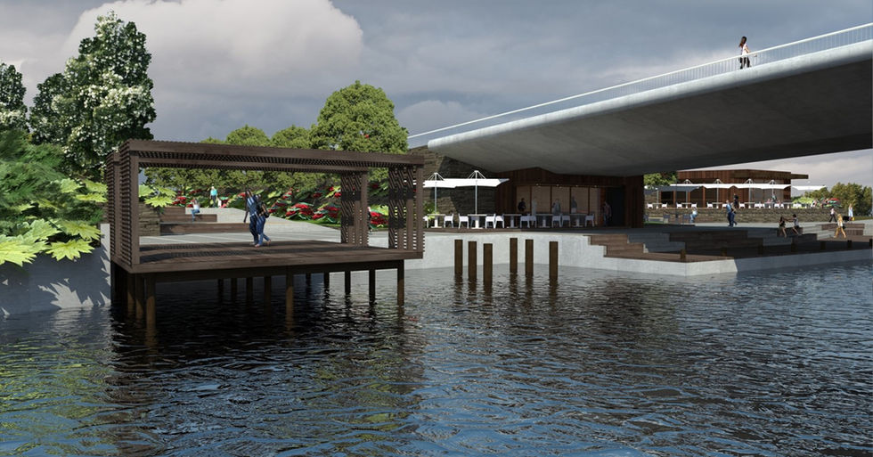 Hacia la zona próxima al rio, se propone un programa asociado a la permanencia y recreación, construyendo así una Plaza de Borde apoyada por un equipamiento asociado. Dentro de esta extensión, se plantean además cuatro volúmenes que apoyan a la permanencia en este gran sector.